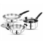 - 3-piece stainless steel cookware set – includes a 2.2l kadhai, 1.4l fry pan, and 1.2l saucepan, ideal for boiling, frying, and sautéing. Designed for daily cooking needs, perfect for Indian kitchens and meal prep.